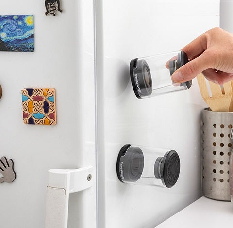 They can be used together, separately or independently. Thanks to their magnetic base, they can be attached and used as a single more powerful loudspeaker, or placed in a multitude of positions attached to metal surfaces.